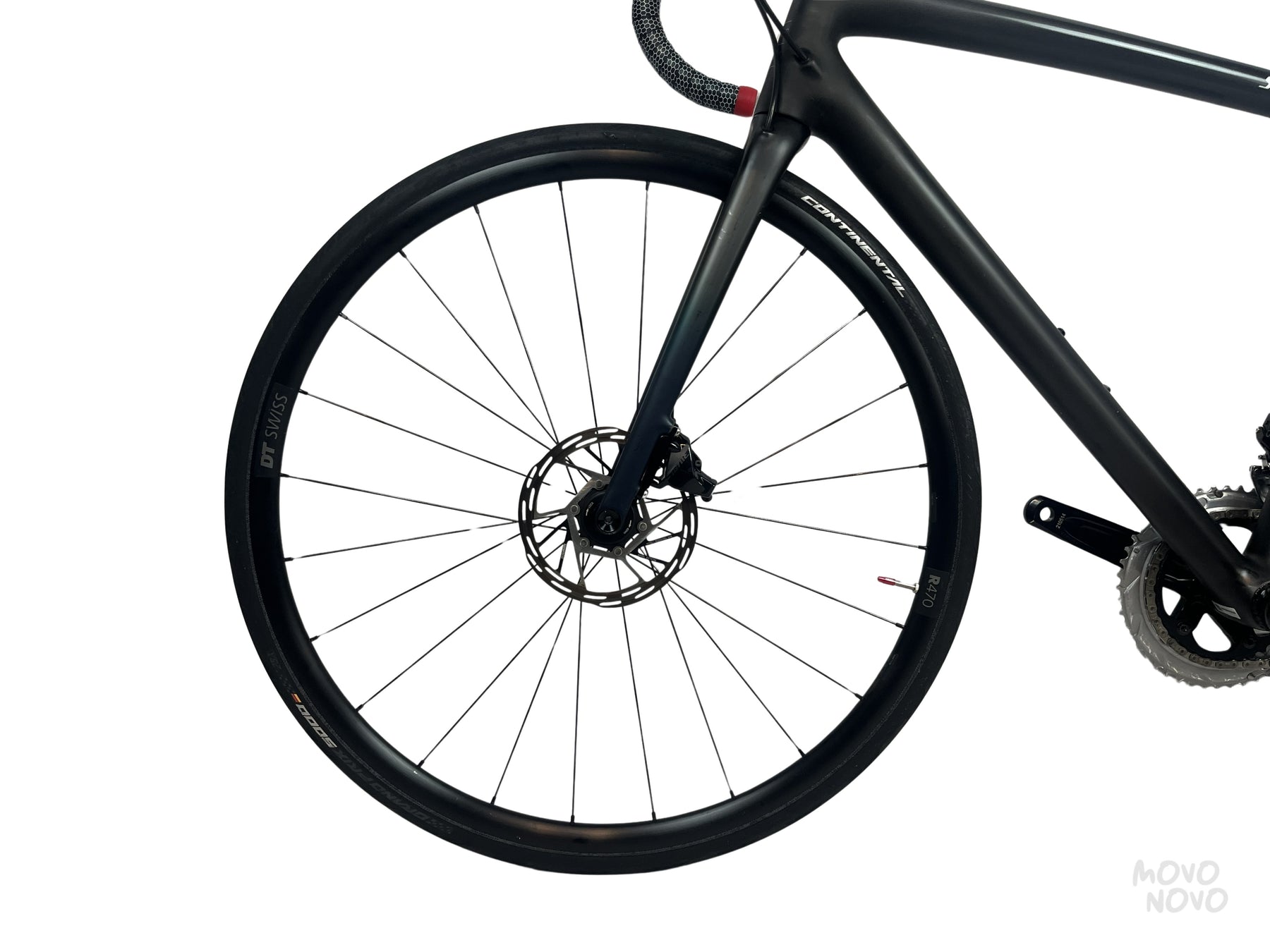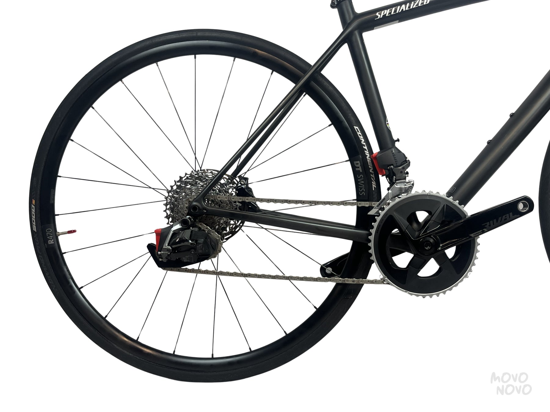 La bicicleta está equipada con una transmisión SRAM Rival AXS 2x12, rines DTSwiss