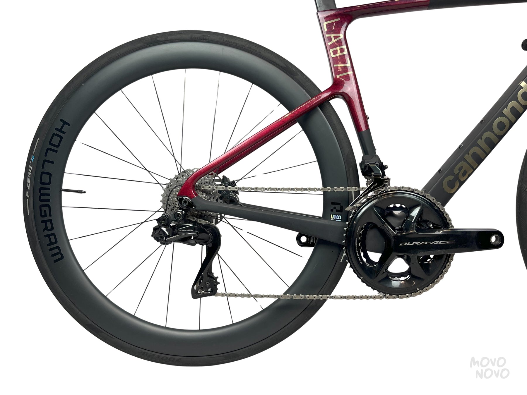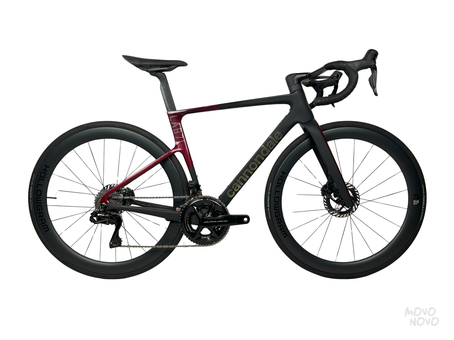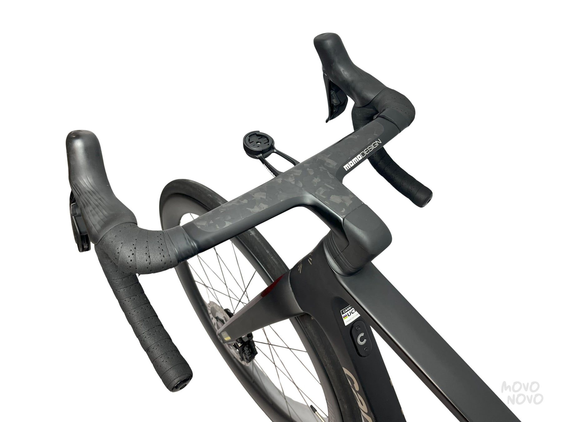 La bicicleta esta equipada con una transmisión Shimano Dura-Ace Di2 2x12, rines de carbono Hollowgram y manillar Momo Design de carbono