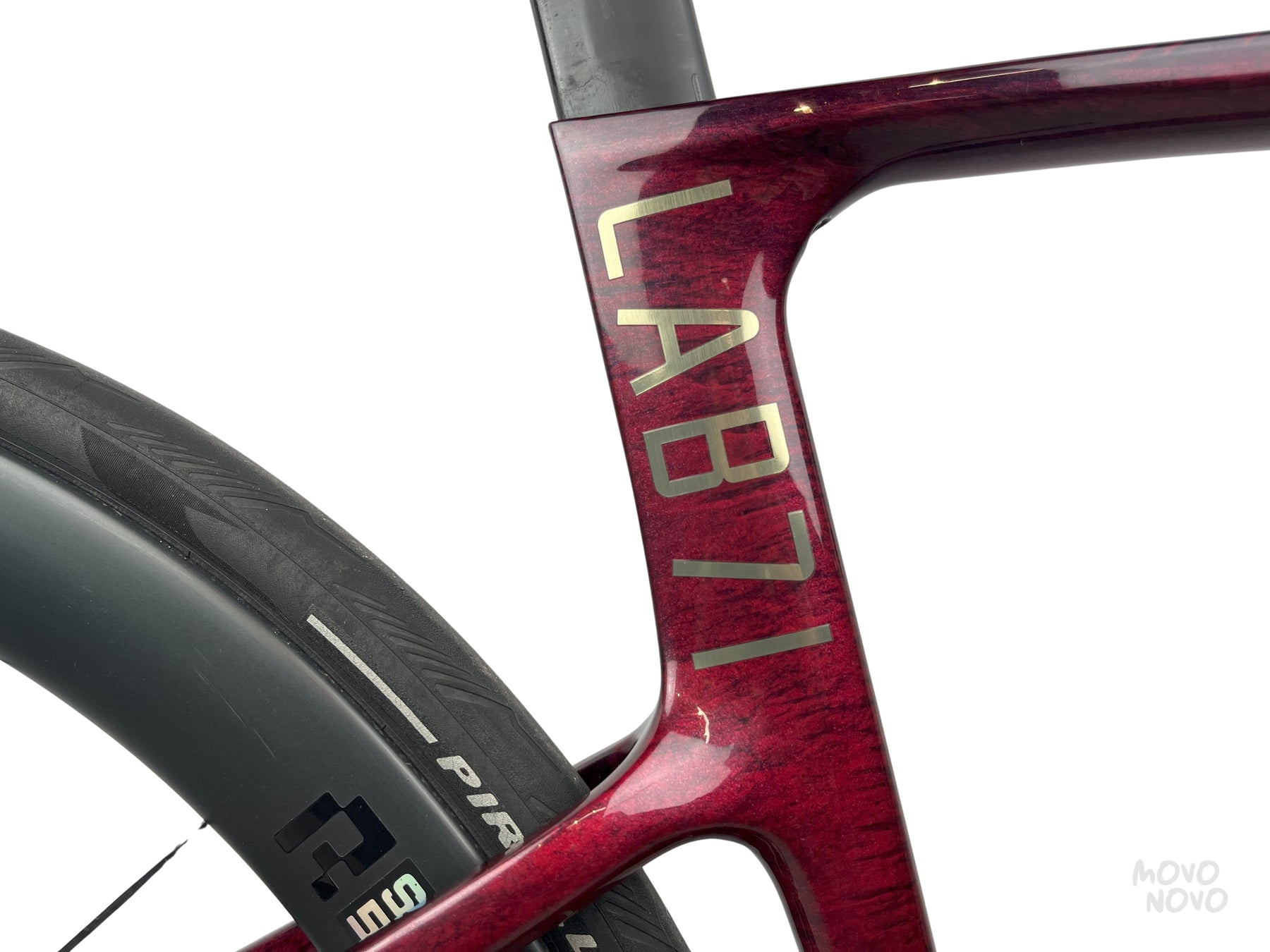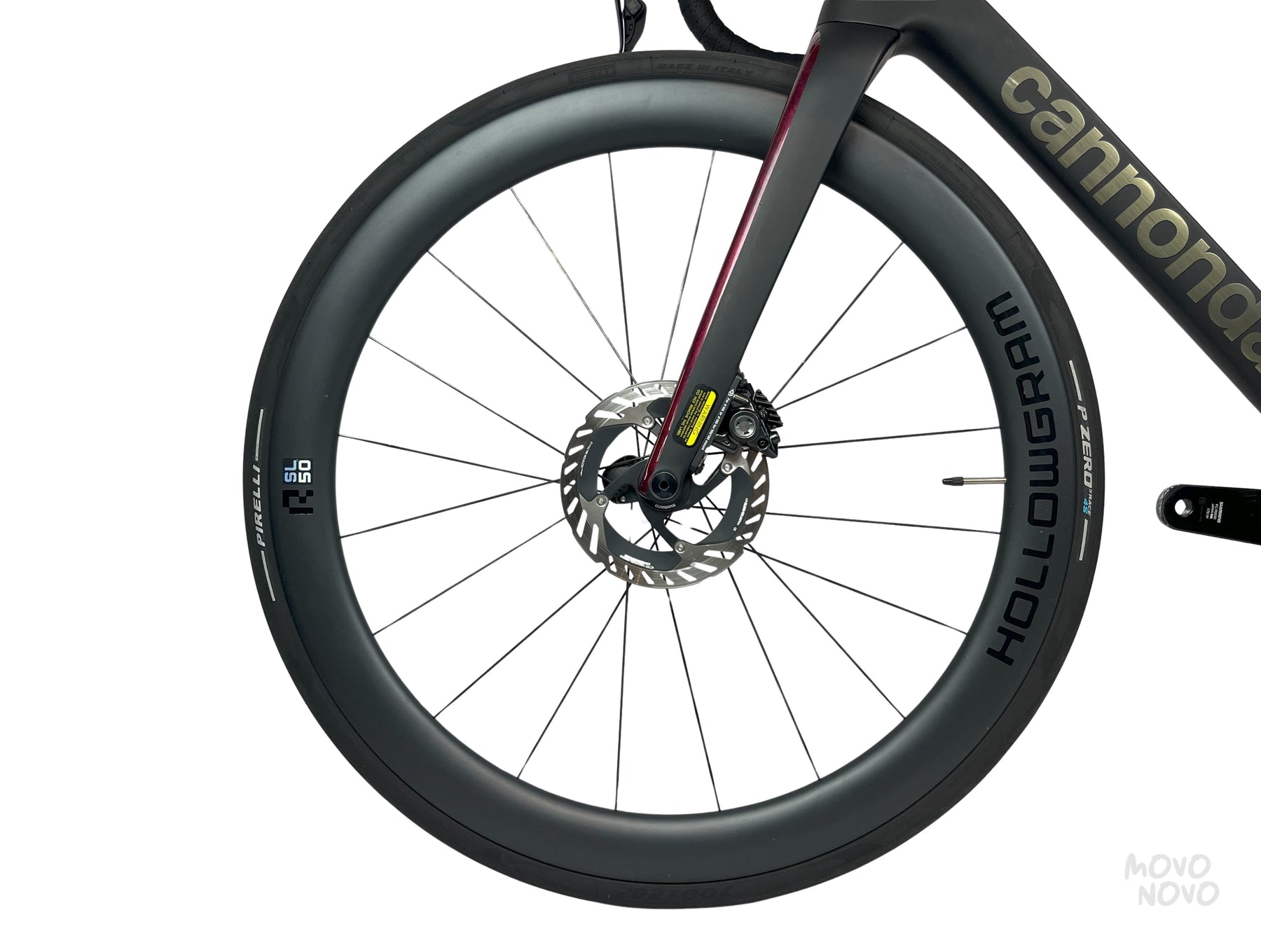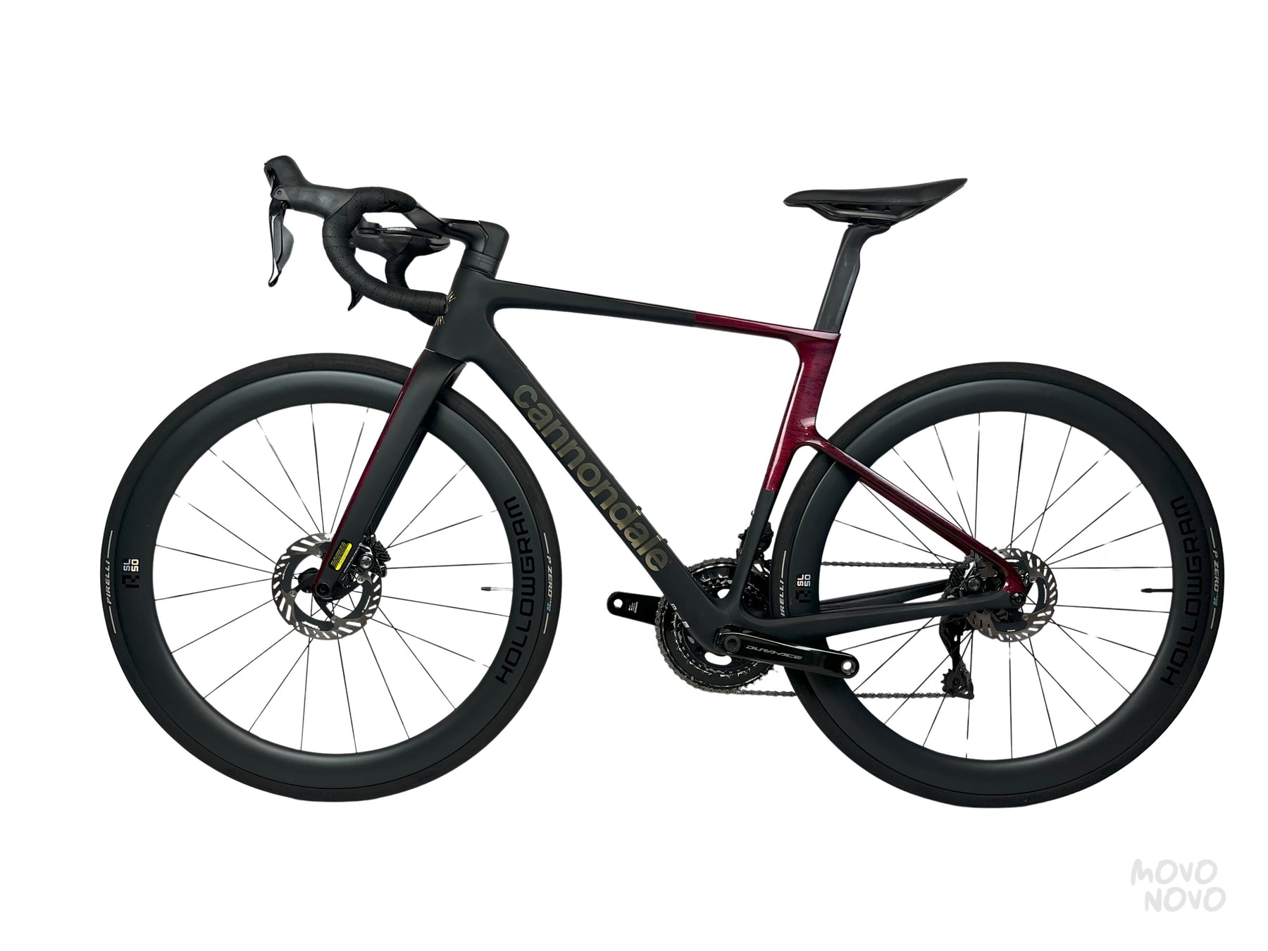 La bicicleta esta equipada con una transmisión Shimano Dura-Ace Di2 2x12, rines de carbono Hollowgram y manillar Momo Design de carbono