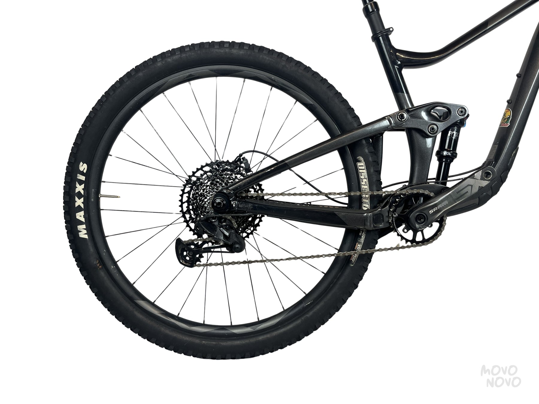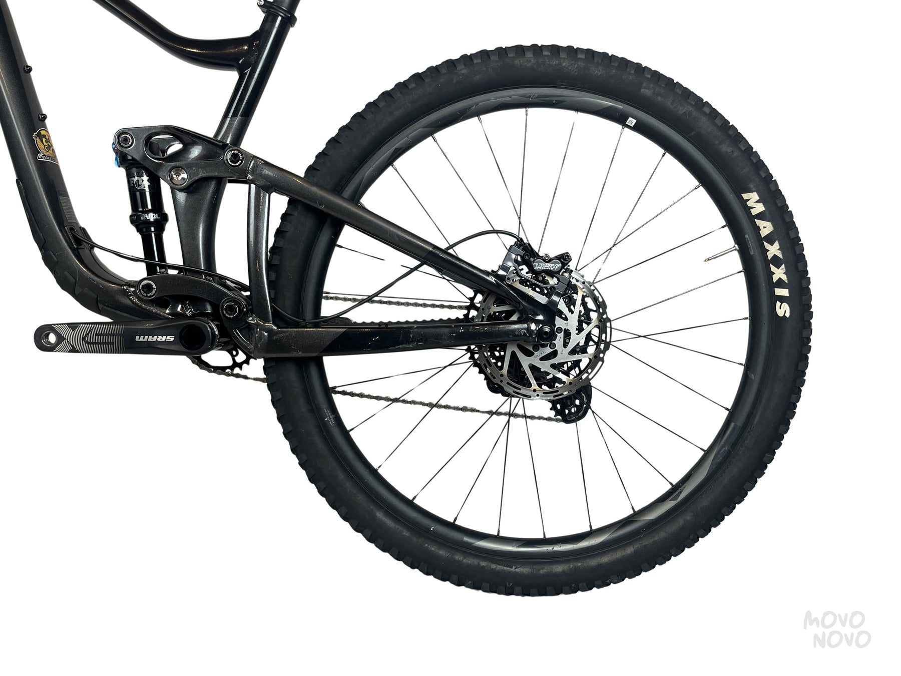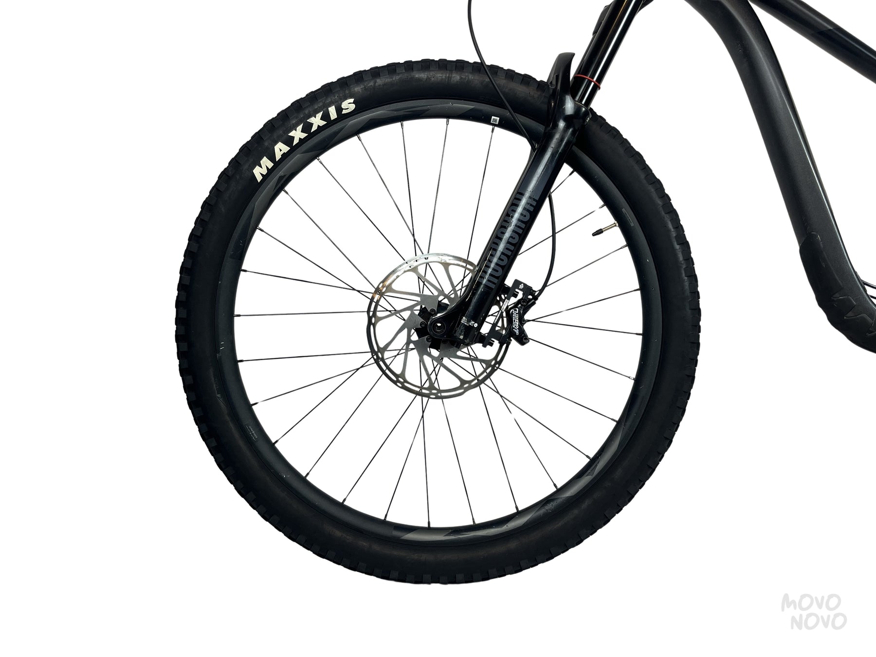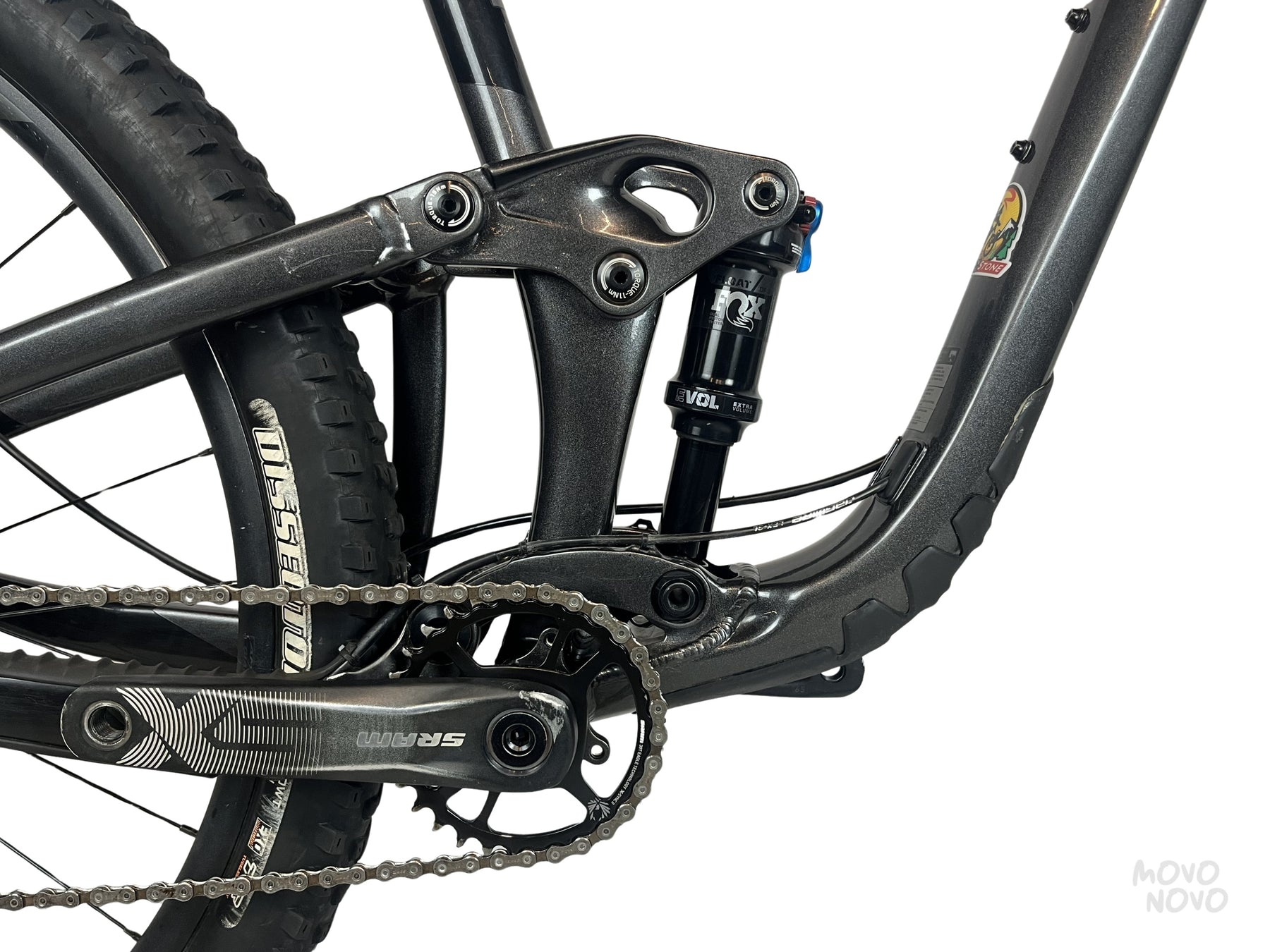 La bicicleta está equipada con una transmision SRAM SX 1x12, frenos Tektro Orion, suspension RockShox 35 y shock Fox Float DPS