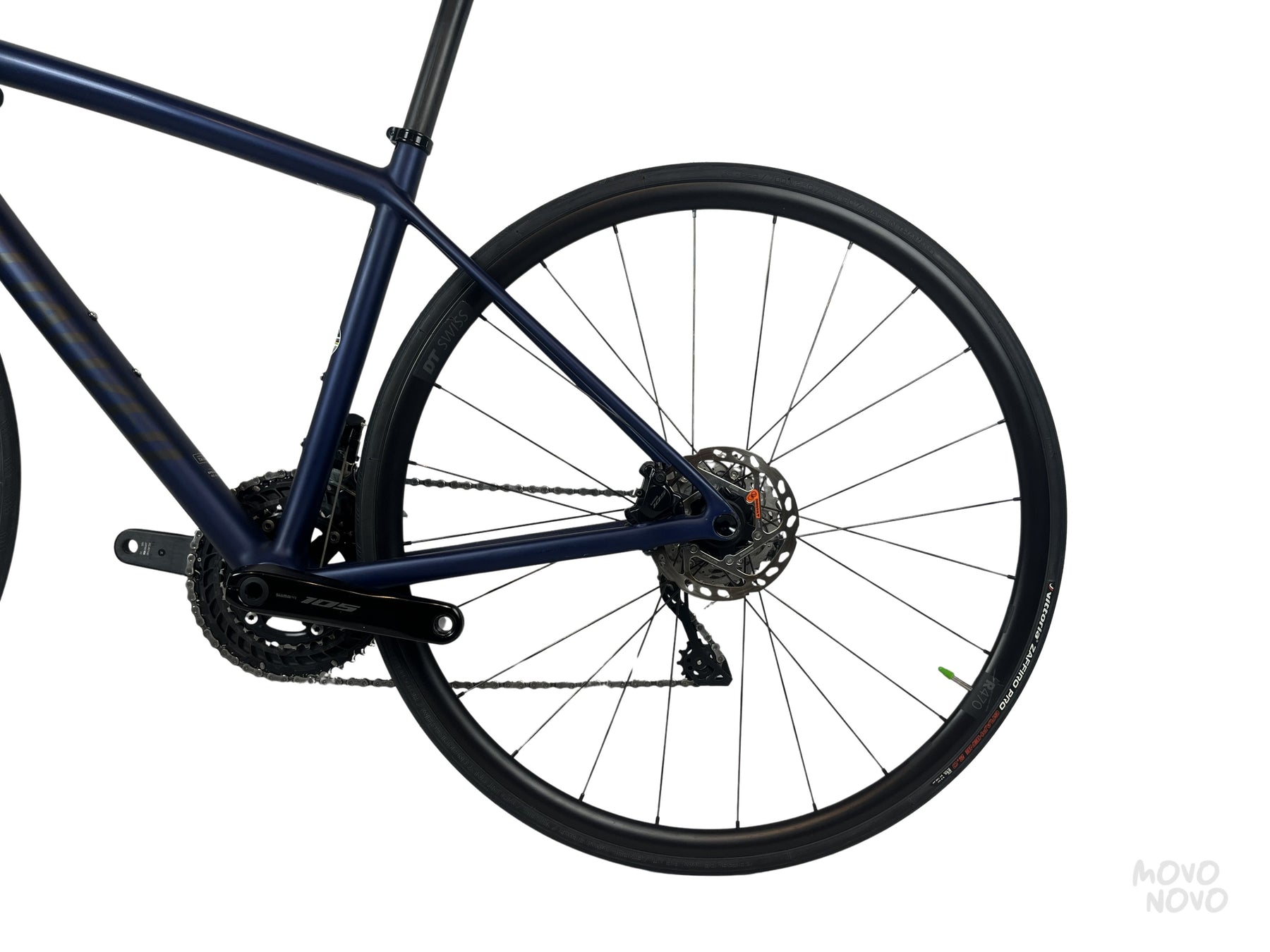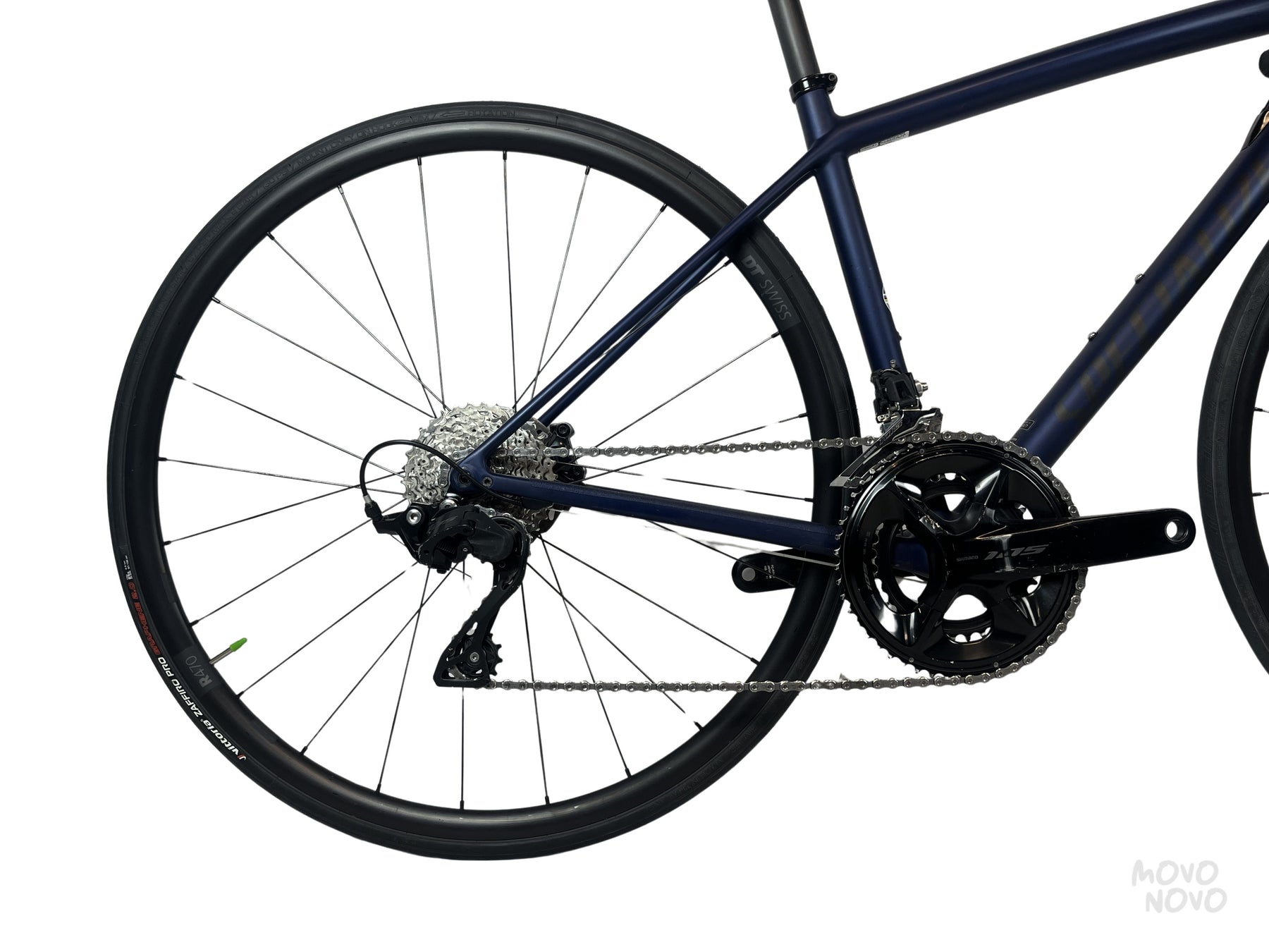 La bicicleta está equipada con una transmisión Shimano 105 mecánica y rines de aluminio DTSwiss